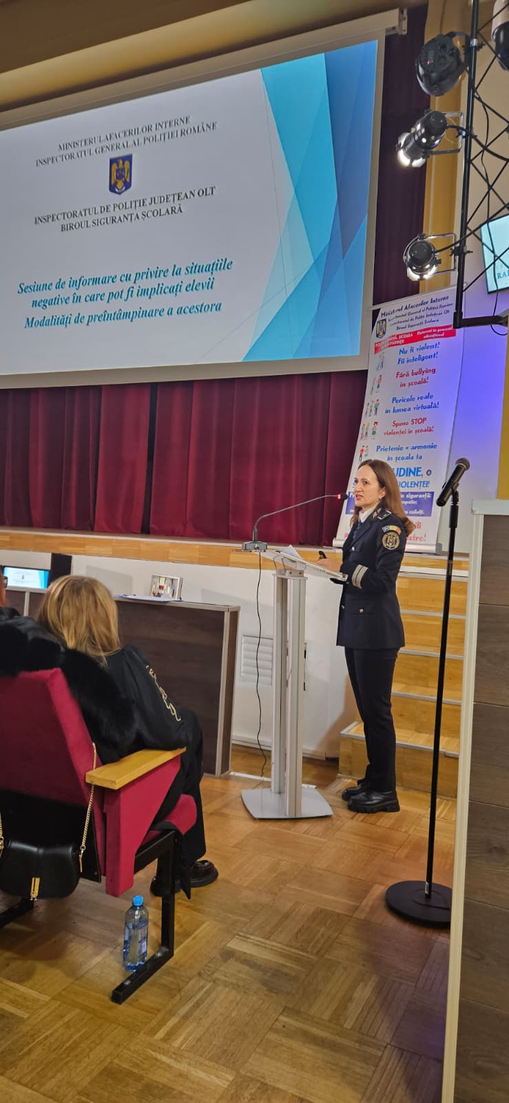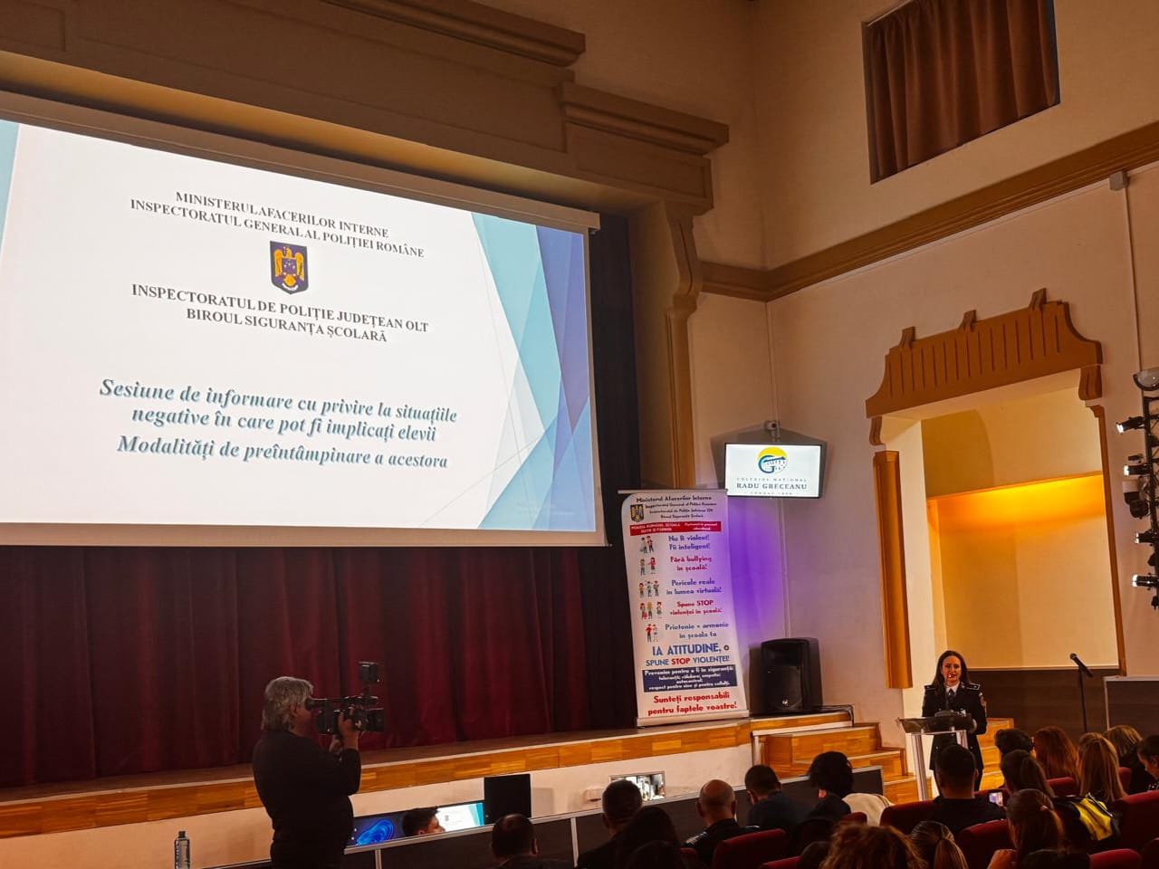 La data de 27 noiembrie a.c., polițiștii Biroului Siguranța Școlară, din cadrul Inspectoratului de Poliție Județean Olt, împreună cu ce ai Compartimentului de Analiză și Prevenire a Criminalității, în parteneriat cu jandarmi ai Inspectoratuiui de Jandarmi Județean Olt și reprezentanți ai Inspectoratului Școlar Județean Olt, Spitalul de Psihiatrie Cronici Schitu Greci, Centrul Județean de Resurse și de Asistență Socială Educațională Olt, Direcția de Sănătate Publică, Direcția Generală de Asistență Socială, Consiliul Județean al Elevilor au desfășurat o sesiune de informare a părinților și persoanelor care au atribuții de educare a minorilor cu privire la situațiile negative în care pot fi implicați minorii și recomandări de preîntampinare a acestora, la amfiteatrul Colegiului Național ”Radu Greceanu” din municipiul Slatina, județul Olt.